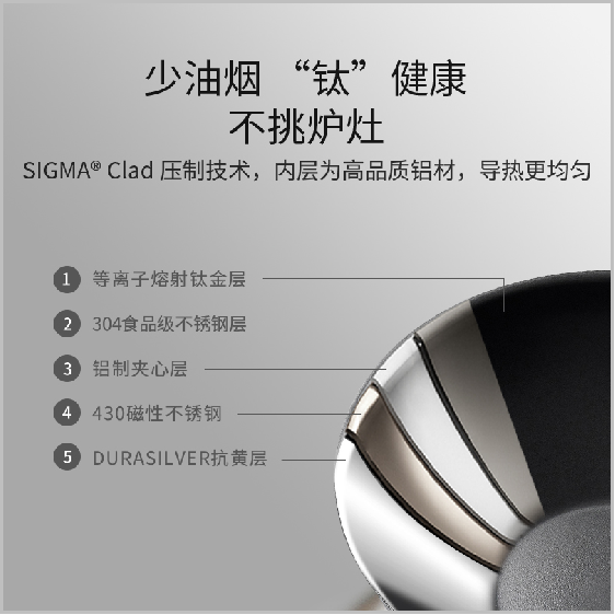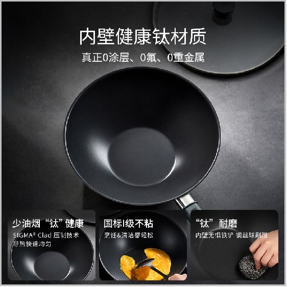 锅身直径 :30cm 包装尺寸 :55×37×13cm · 内壁钛材质:真正0涂层、0氟、0重金属 · 精钛工艺和厨房美学:是锅具,也是艺术品 · 轻盈实材:真材实料,但轻巧称手 · 少油烟“钛”材质:SIGMA®Clad压制技术,导热快速均匀 · 国标I级不粘:烹饪清洁都轻松 · “钛”耐磨:内壁无惧铁铲、钢丝球剐蹭 · 不挑炉灶,可用洗碗机清洗